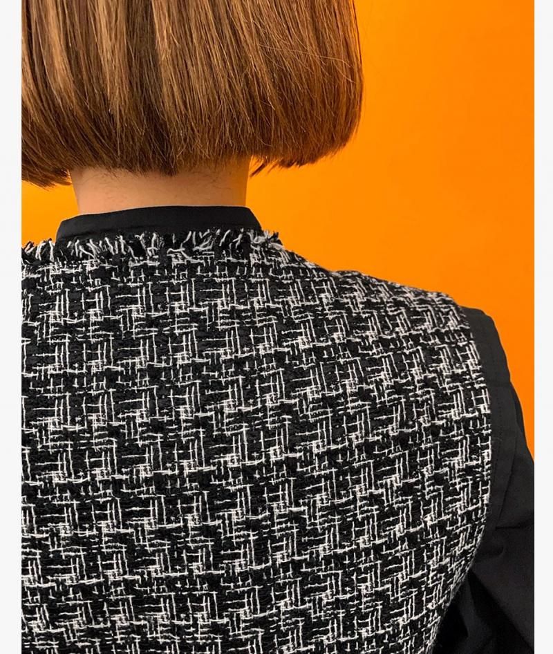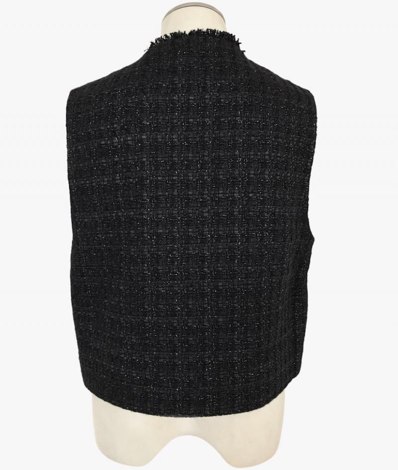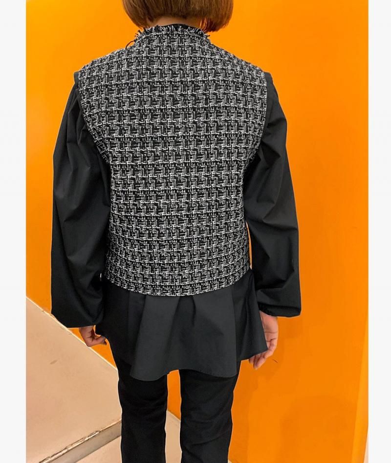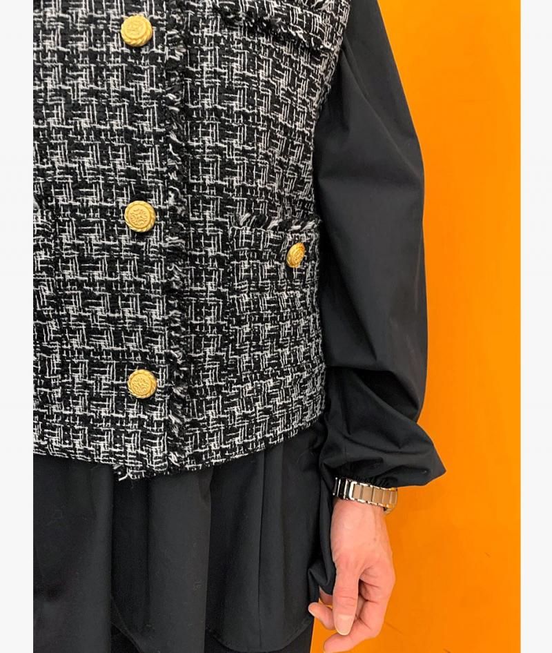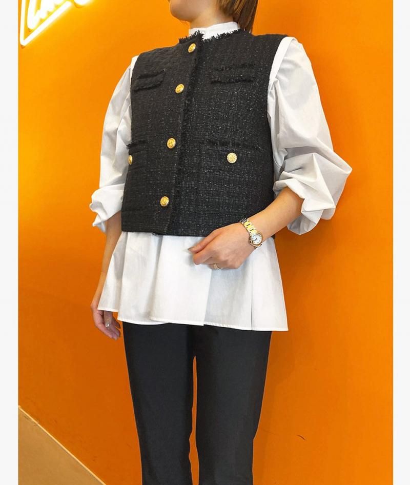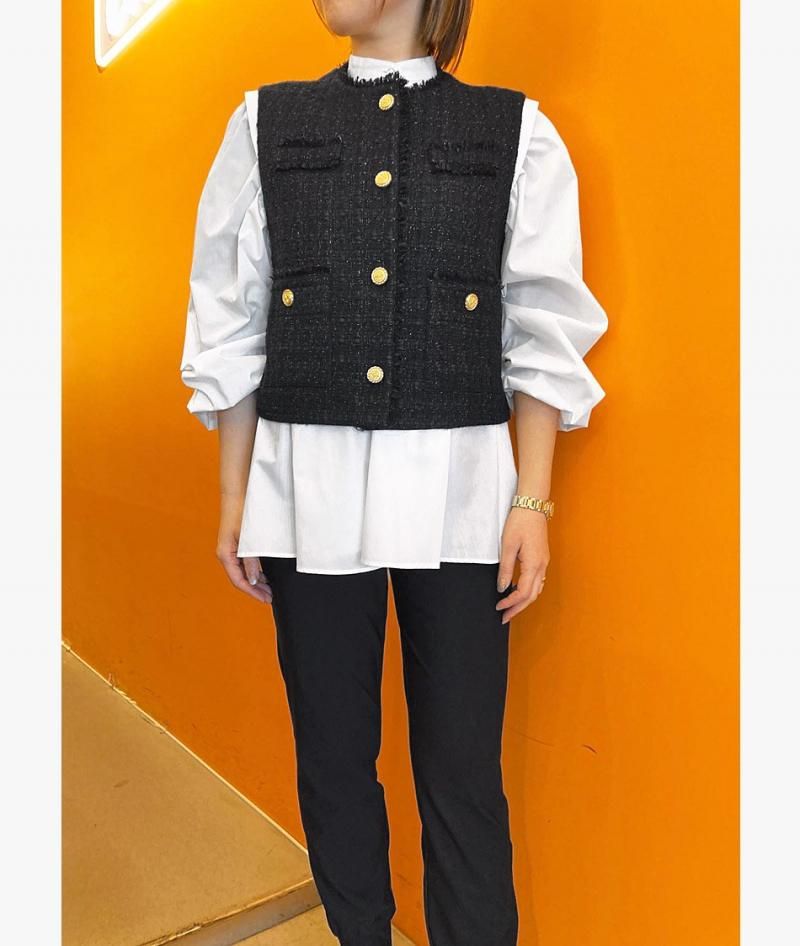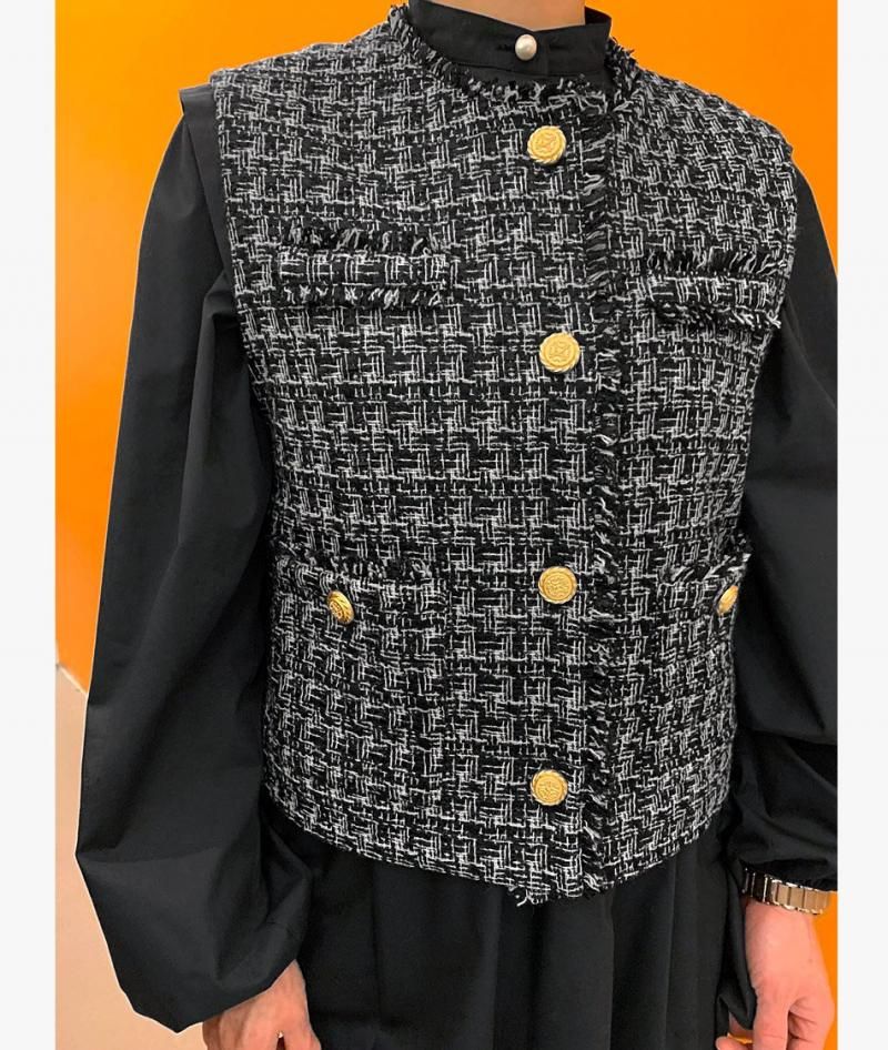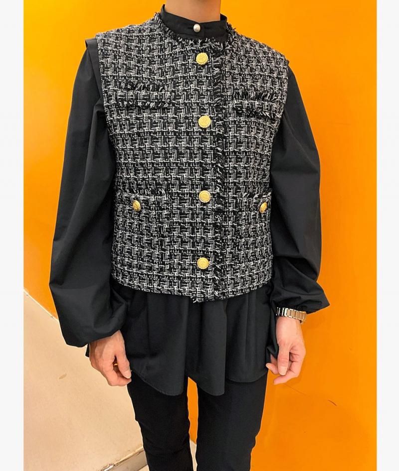 ツイードにラメ糸とゴールドボタンがポイントになったショート丈ツイードジレ。