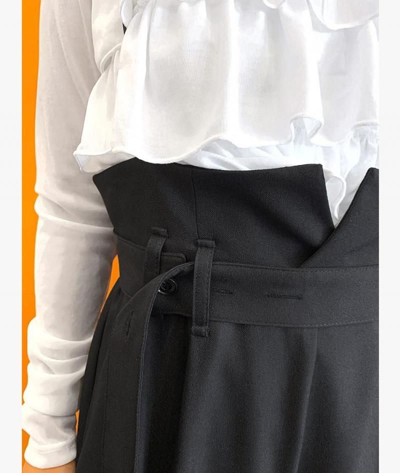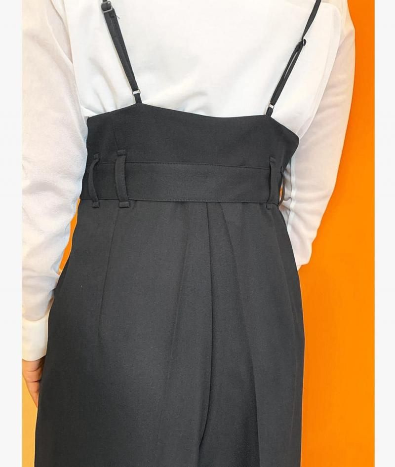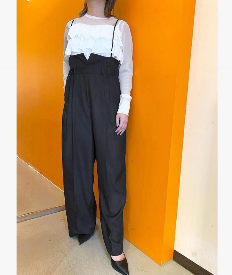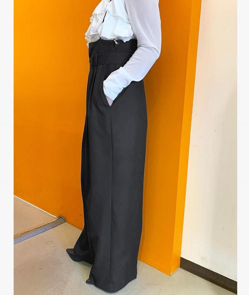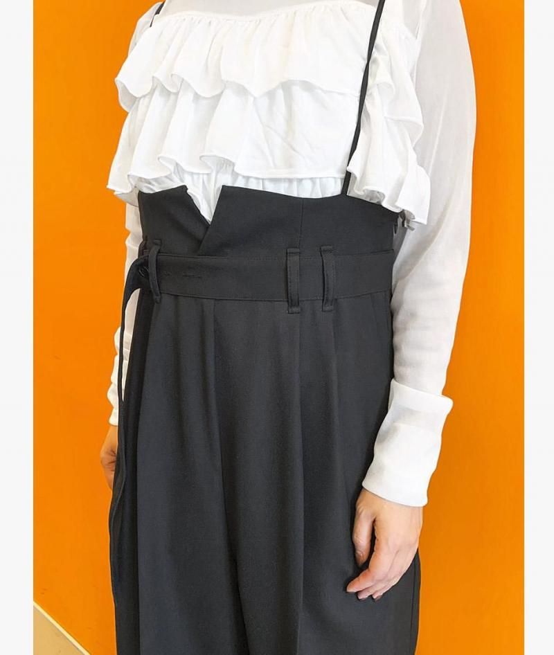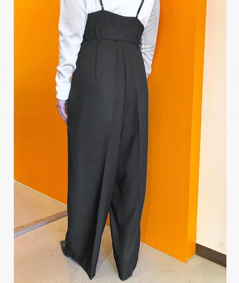 ウエストベルト付きのサスペンダー付きタックワイドパンツ。