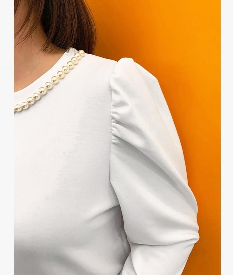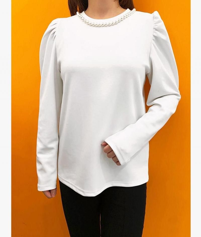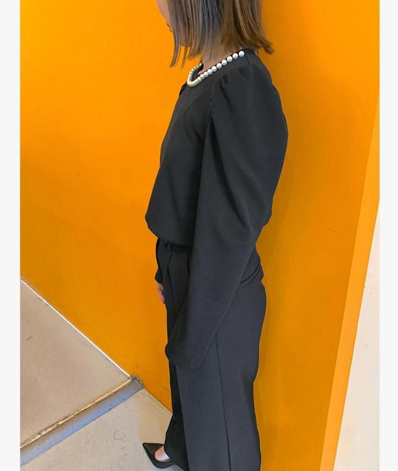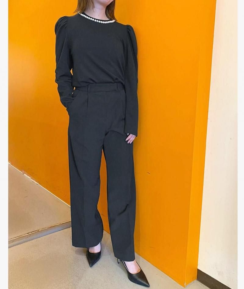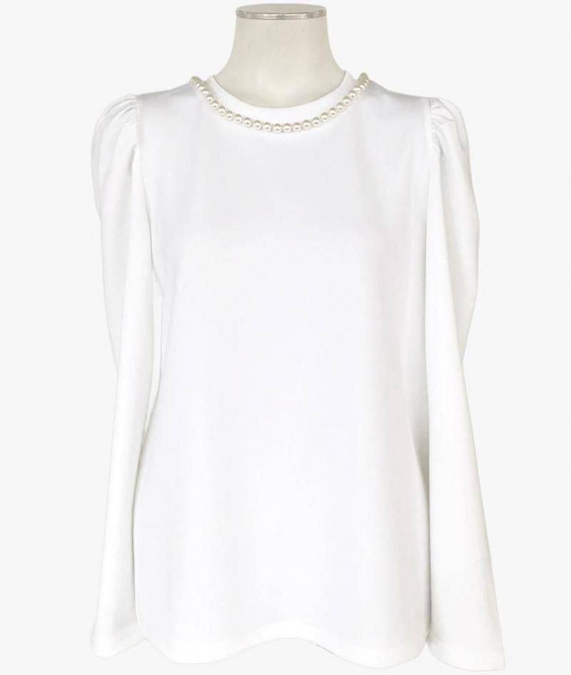 ストレッチが効いていて着心地が良く、首元にパールが付いて華やかなトップス。