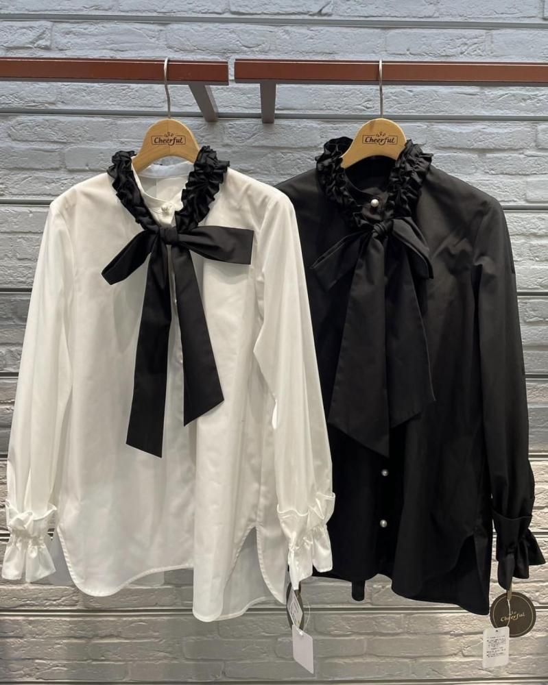 クラシカルな雰囲気を演出するリボン付のブラウス。