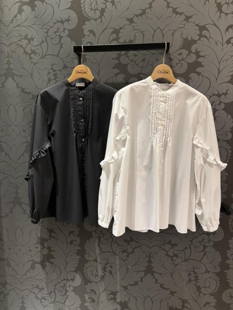 フロントのピンタックがつくる縦ラインがきちんと感のある表情に。